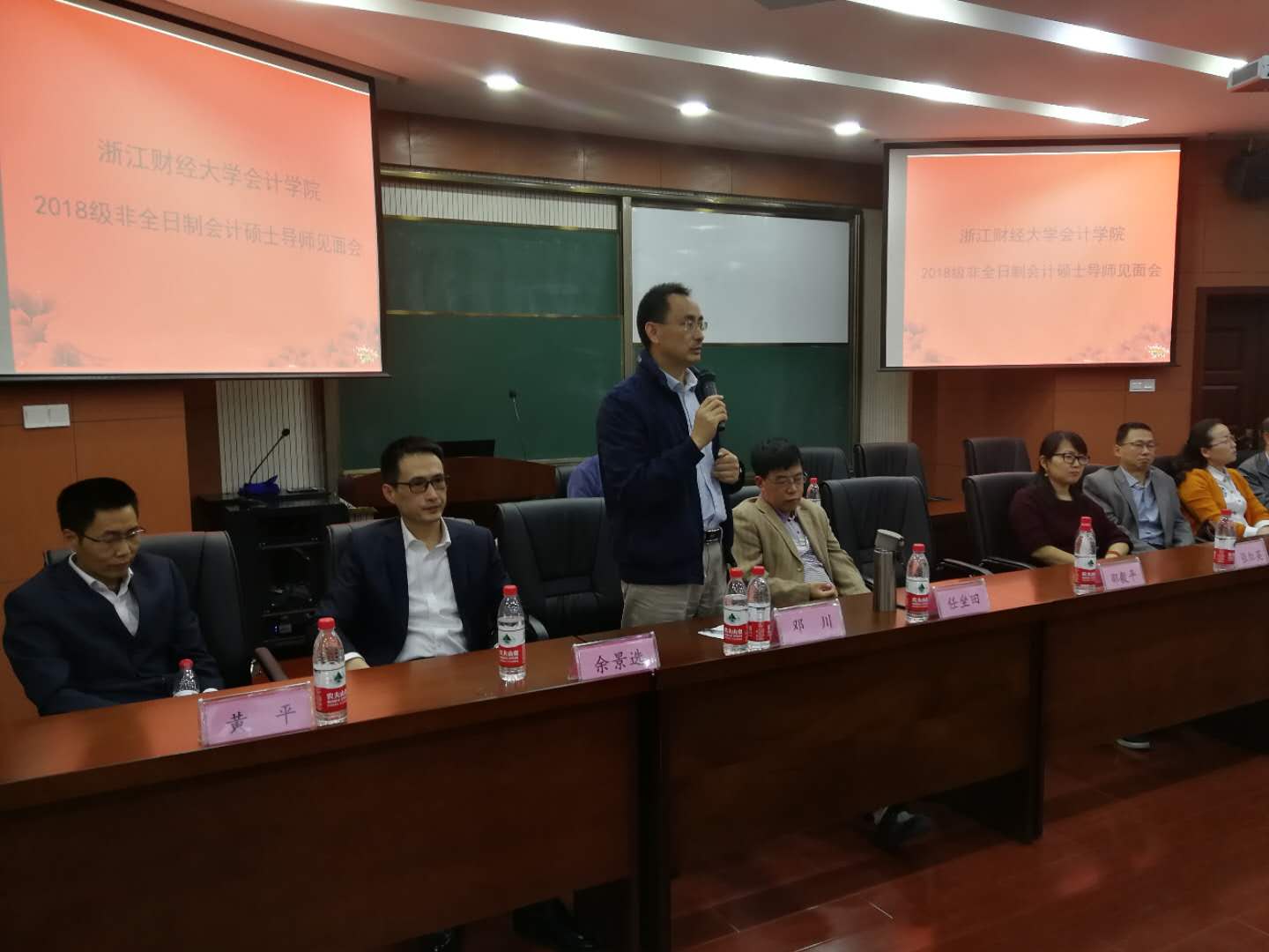 紧接着,每位硕士生导师就各自的研究领域、专业特长、教学成果等分别进行相关介绍。邵毅平老师向研究生们讲述了三十多年来自己在浙江财经大学的经历并且一直怀揣着一颗对会计专业热爱的心,引发了员工们的共鸣;张红英老师表达了对同学们的期望,她希望同学们在接下来的学习中能够树立目标,积极进取,努力提升自己的学术能力。老师们博学儒雅、幽默风趣的发言给同学们留下了深刻的印象。