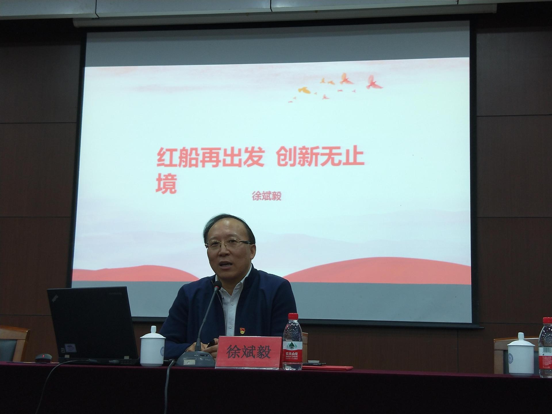 接着,徐斌毅董事长为大家作了题为“红船再出发 创新无止境”的专题讲座。报告从解读“红船精神”的内涵开始:“开天辟地、敢为人先的首创精神,坚定理想、百折不挠的奋斗精神,立党为公、忠诚为民的奉献精神”,并强调红船精神是中国革命精神之源,昭示着中国共产党人的初心。徐斌毅董事长结合企业创新创业,快速发展的实践,一张张图表,一组组数据,再现了共产党人的创新精神。最后徐斌毅董事长对在座的各位提出三点期望,以首创精神为引领,以奋斗实干为标杆,以奉献担当为使命 。