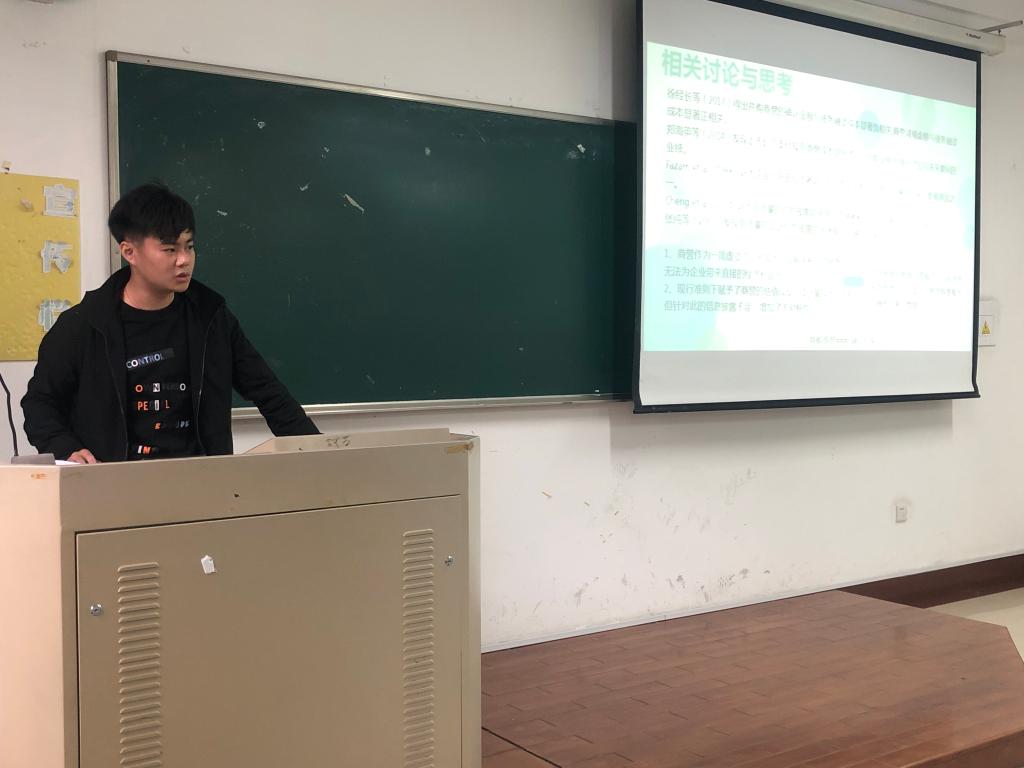 谢德健同学讲解了题目为《管理者过度自信、产权性质与并购商誉》的文章。讲解从引言、样本与变量、实证分析讨论、进一步研究、结论与讨论几方面,讨论了关于目前资本市场关于公司巨额商誉的热点问题。研究结果表明,公司管理层如果在当年增持了公司的股份,新增商誉也越大。谢建德同学在讲解最后也对该文章进行了一定的拓展和思考。