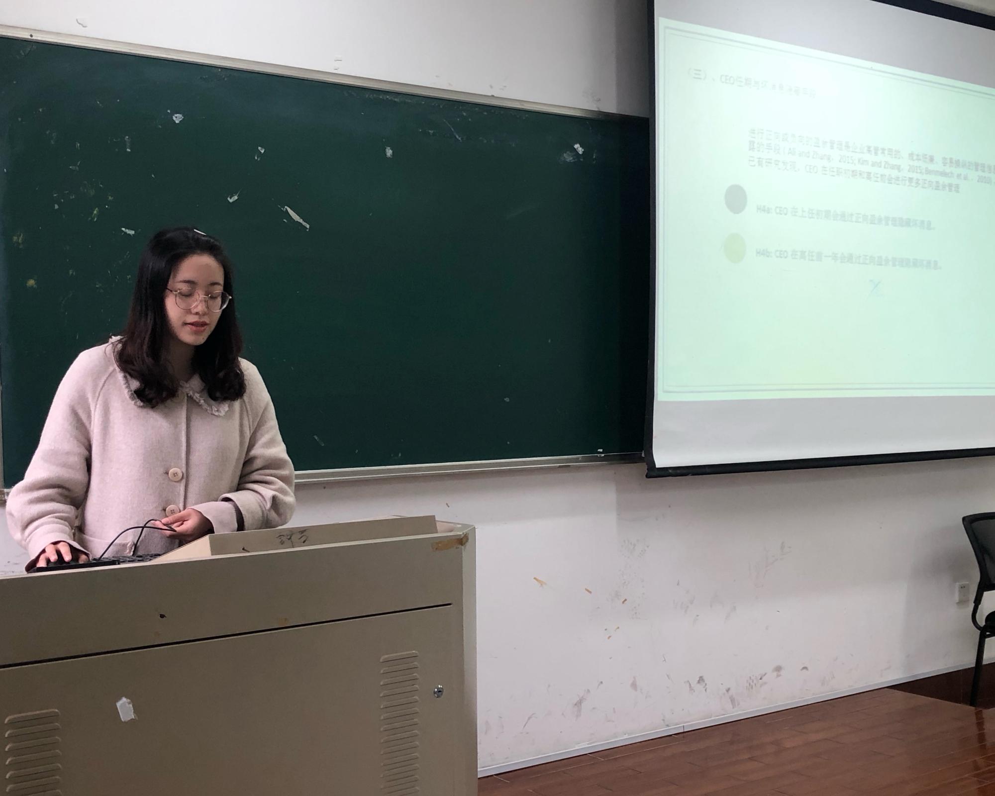 首先,赵方舟同学讲解题目为《高管任期与公司坏消息的隐藏》的论文。讲解从研究背景、研究假设、研究方法、研究结论、研究展望等几个方面展开。文章使用1999—2014年中国A股上市公司的数据,考察CEO在任期不同阶段如何隐藏公司坏消息和其手段,以及产权性质如何影响上述关系。研究发现:(1)CEO在任职初期(前三年)和离任前一年会更多地隐藏坏消息,且上述效应在非国有企业中更为显著;(2)CEO上任第一年会集中披露前任CEO隐藏的坏消息;(3)"盈余管理"是CEO隐藏坏消息的一种手段;(4)家族企业中,只有非家族成员CEO有出于职业生涯考虑而隐藏坏消息的动机。本文的研究结论揭示了CEO在任期内对公司坏消息管理的动态演变过程,对于深入认识CEO如何管理公司信息流、如何约束CEO管理信息披露的行为以及降低股价崩盘风险具有重要的理论和现实意义。