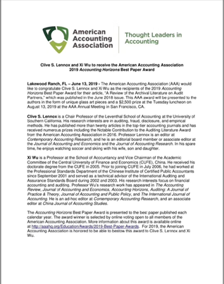 (记者:杨丹妮)近日,2019年Accounting Horizons最佳论文奖在线投票结果出炉,公司99届国际会计优秀员工吴溪教授荣获2019 Accounting Horizons Best Paper Award。