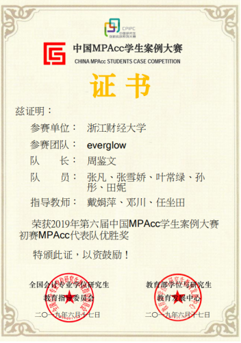 由全国会计专业学位研究生教育指导委员会、教育部学位与研究生教育发展中心主办的全国研究生创新创业实践活动——2019年第六届中国MPAcc员工案例大赛于2019年6月16日落下帷幕。本届大赛从2019年3月到6月历时近4个月,分初赛第一阶段及第二阶段、复赛、决赛四个阶段,共有1998支MPAcc团队报名,近12000名MPAcc员工参赛。公司研究生周鉴文、张凡、张雪娇、叶常绿、孙彤、田妮等人组成的everglow队获得“2019年第六届中国MPAcc员工案例大赛初赛MPAcc代表队优胜奖”。