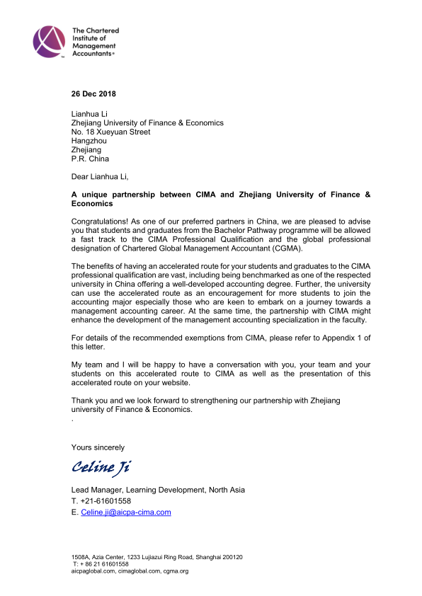 来信中写道:祝贺!作为我们在中国的首选合作伙伴之一,贵校CIMA方向班的员工将被允许快速获得CIMA职业资格和特许全球管理会计师(CGMA)的头衔……。