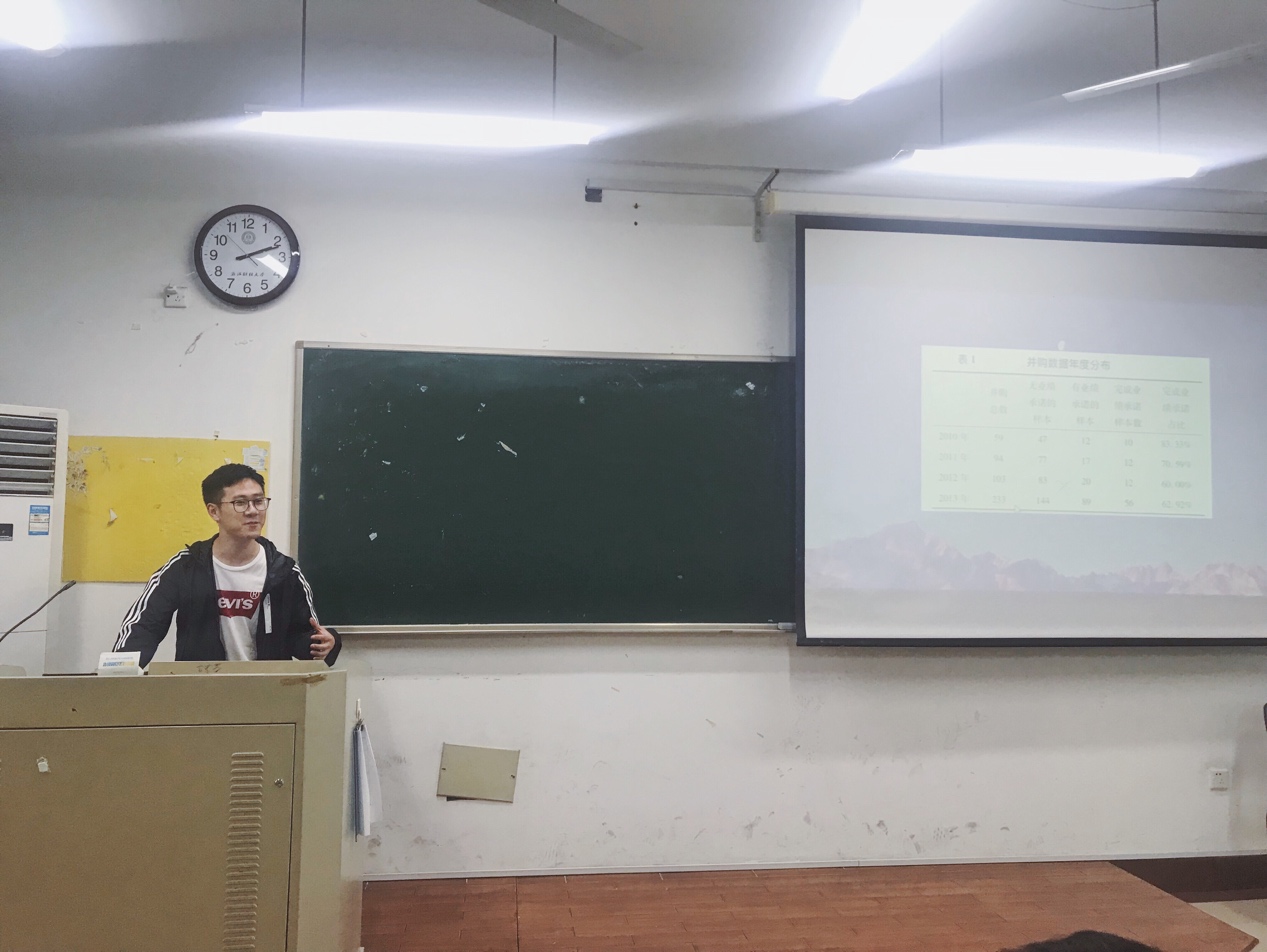 其次,刘天成同学讲解的文章题目为《业绩补偿承诺对标的企业的激励效应研究——来自中小板和创业板上市公司的实证检验》。该文章立足于近年来很多上市公司采用业绩补偿承诺协议作为并购交易定价事后调整来激励企业业绩的提升的背景,手工采集来自2010年-2013年中小板和创业板上市公司的相关信息数据,考察了业绩补偿承诺对标的企业的激励效应,通过实证研究发现,业绩补偿承诺对并购后标的企业业绩的提升具有激励效应,但相比于单向业绩承诺,双向业绩承诺并没有发挥更显著的激励作用,激励效应与承诺的业绩增长率呈倒U型的相关关系,即随着承诺业绩增长率的提高,激励效应呈现先上升后下降的状态。文章指出了业绩补偿承诺协议在实际应用中的价值和可能存在的不足,对优化并购定价机制具有一定的借鉴作用。