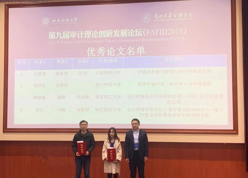 第九届审计理论创新发展论坛总计收到论文137篇,经过评审专家初审、专家匿名通讯评审以及中国政府审计研究中心学术委员会专家会议终审,公司邓川教授与研究生提交的论文荣获优秀论文奖。(文:俞凯玥)