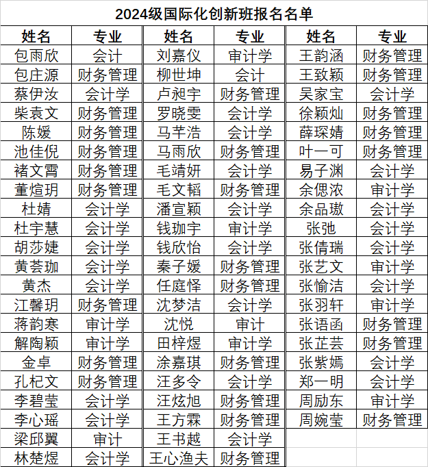 报名2024级国际化创新班名单如下,请报名的同学于8月10日16点前加入微信群,后续预录取及缴费通知将在微信群发布。如对名单有疑问,请联系葛老师,电话:0571-87557100。