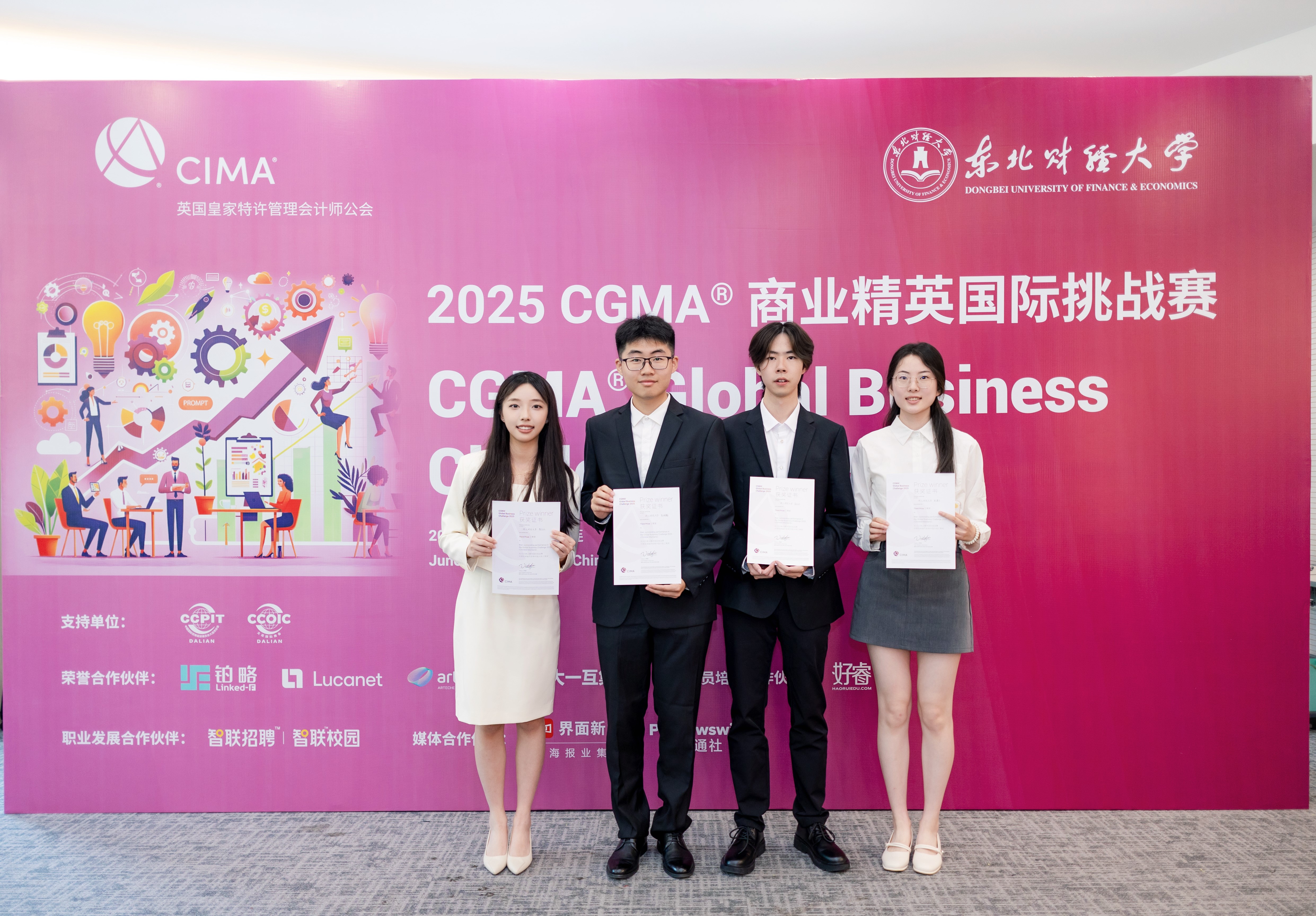 6月6日上午,2025CGMA商业精英国际挑战赛中国大陆半决赛在东北财经大学成功举行。公司21CIMA班陈乐乐、23CIMA班金孙正、22ACCA3陈琳翰、23财会类1班张潇予组成的Trytry团队(指导老师:吕岩、史开瑕、刘芳、叶若慧)荣获中国大陆三等奖。