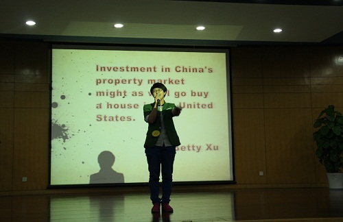 比赛围绕核心命题“Investment inChinese VS American Real Estate”展开全英论述,13为参赛选手以敏锐的洞察、独到的见解、流畅的英语获得台下观众的阵阵掌声。来自公司中美会计专业的林舒紧扣主题娓娓道来,波澜不惊但震慑人心;来自南京审计公司的李昂更以观点的真知灼见、地道的英语与绝佳的现场表现能力征服了评委和观众。最终,经过两轮比拼,李昂同学摘得桂冠,公司许冰凌、林舒包揽二、三名。其余十名选手获得优胜奖。