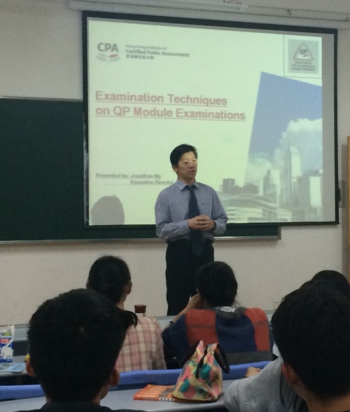 2015年10月15日下午,香港会计师公会执行总监伍大成先生为公司第一次报考香港注册会计师考试(QP)的同学做考前指导。伍大成先生从学习时间安排,工作坊的重要性,考试答题技巧和书写等方面为同学们做了详细的讲解。同学们获益良多,纷纷表示经过此次考前指导,对于QP考试有了更直观的了解,可以有效合理地安排考前复习,希望可以考出好的成绩。 (葛晓蕊)