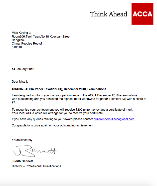 近日,ACCA统考成绩公布,公司17ACCA2班李科颖同学在2018年12月考试中喜获《税法(F6)》单科全球第一名。同时祝贺任课教师于永生。