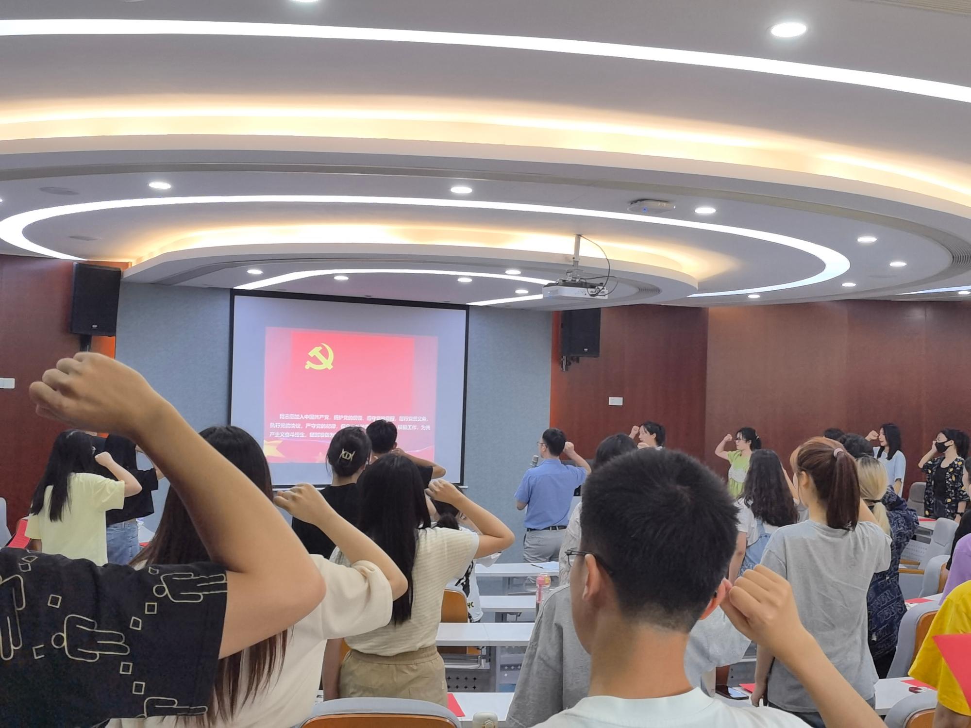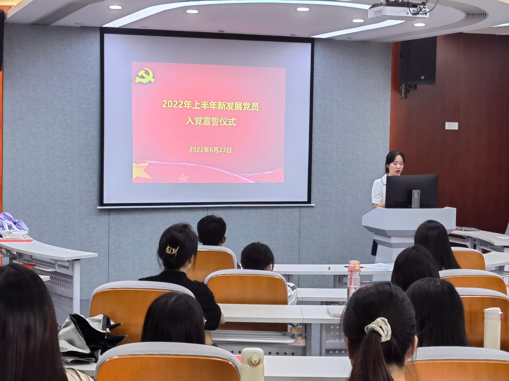 会议伊始,刘义安老师宣读了新发展党员名单。随后,在刘老师的带领下,全体新发展党员面向鲜艳的党旗,举起右拳,庄严宣誓,一字一句,铿锵有力。