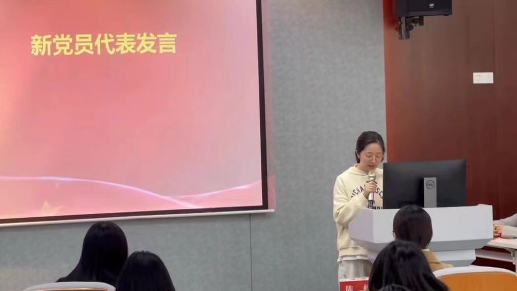 宣誓完毕后,戴结莹同学作为新发展党员代表发言。她讲述了在党组织的教育培养下不断进步的过程,未来将继续严格要求自己,以更加饱满的热情投入学习、工作中,朝着一名优秀共产党员的目标努力奋进。