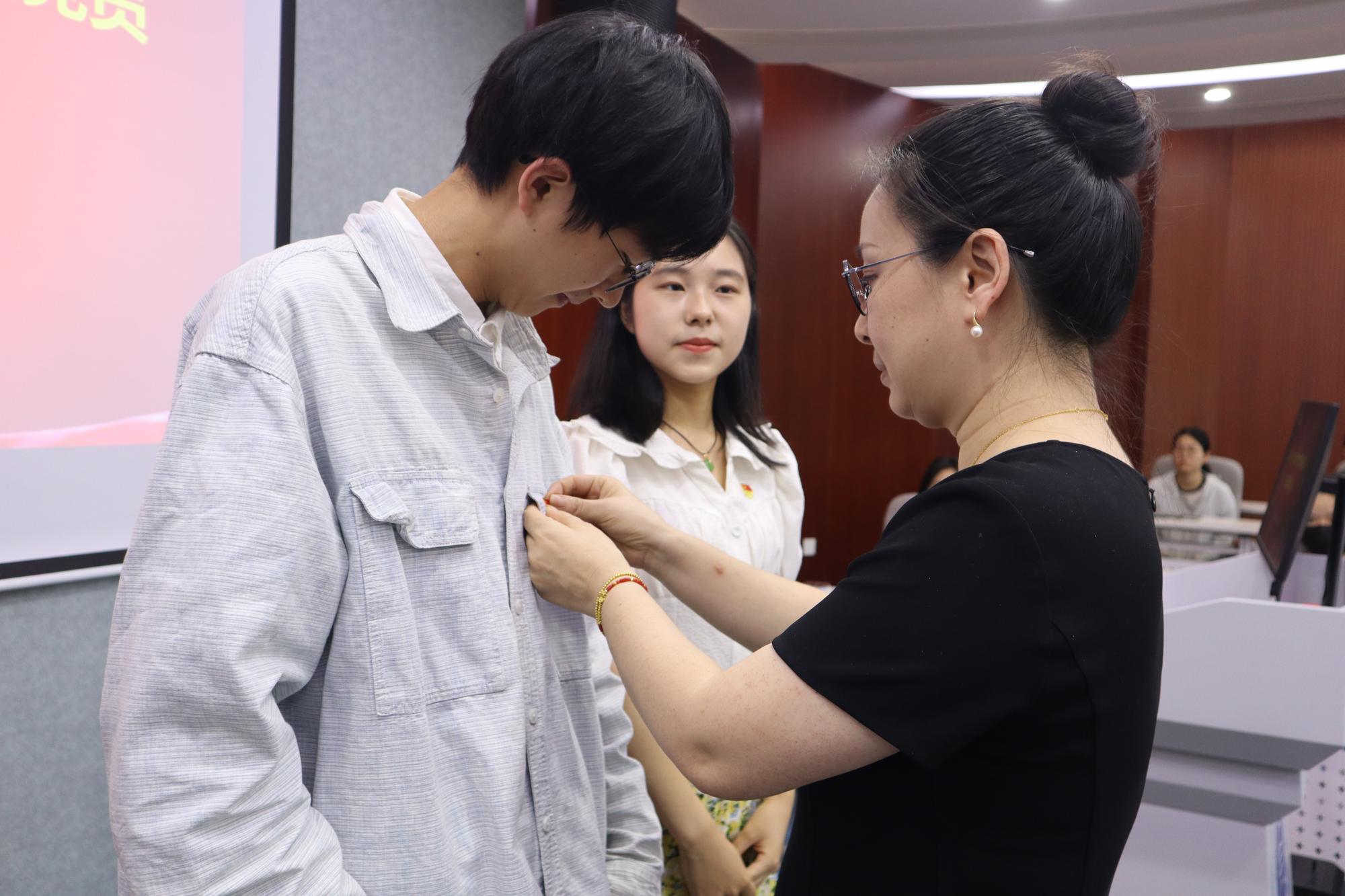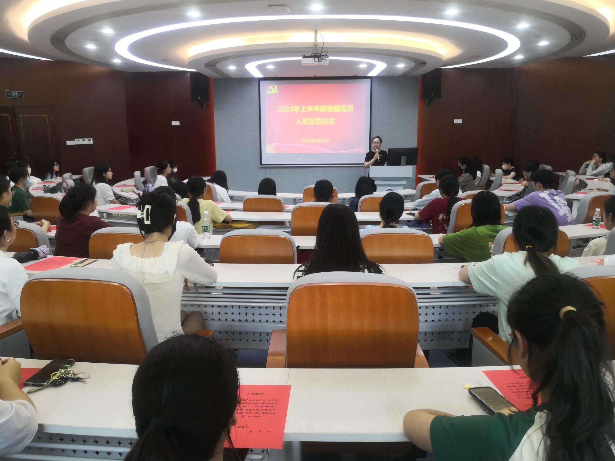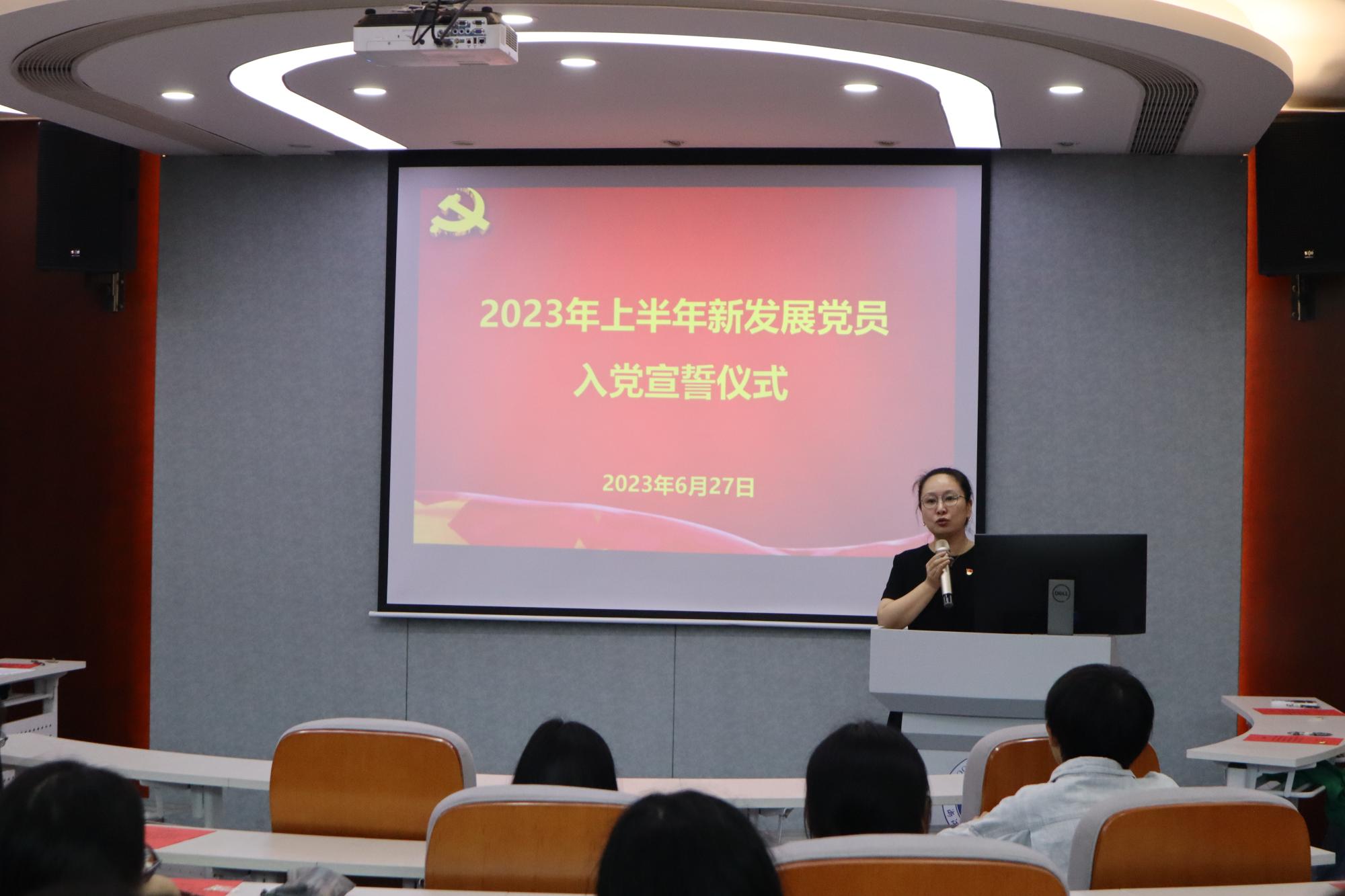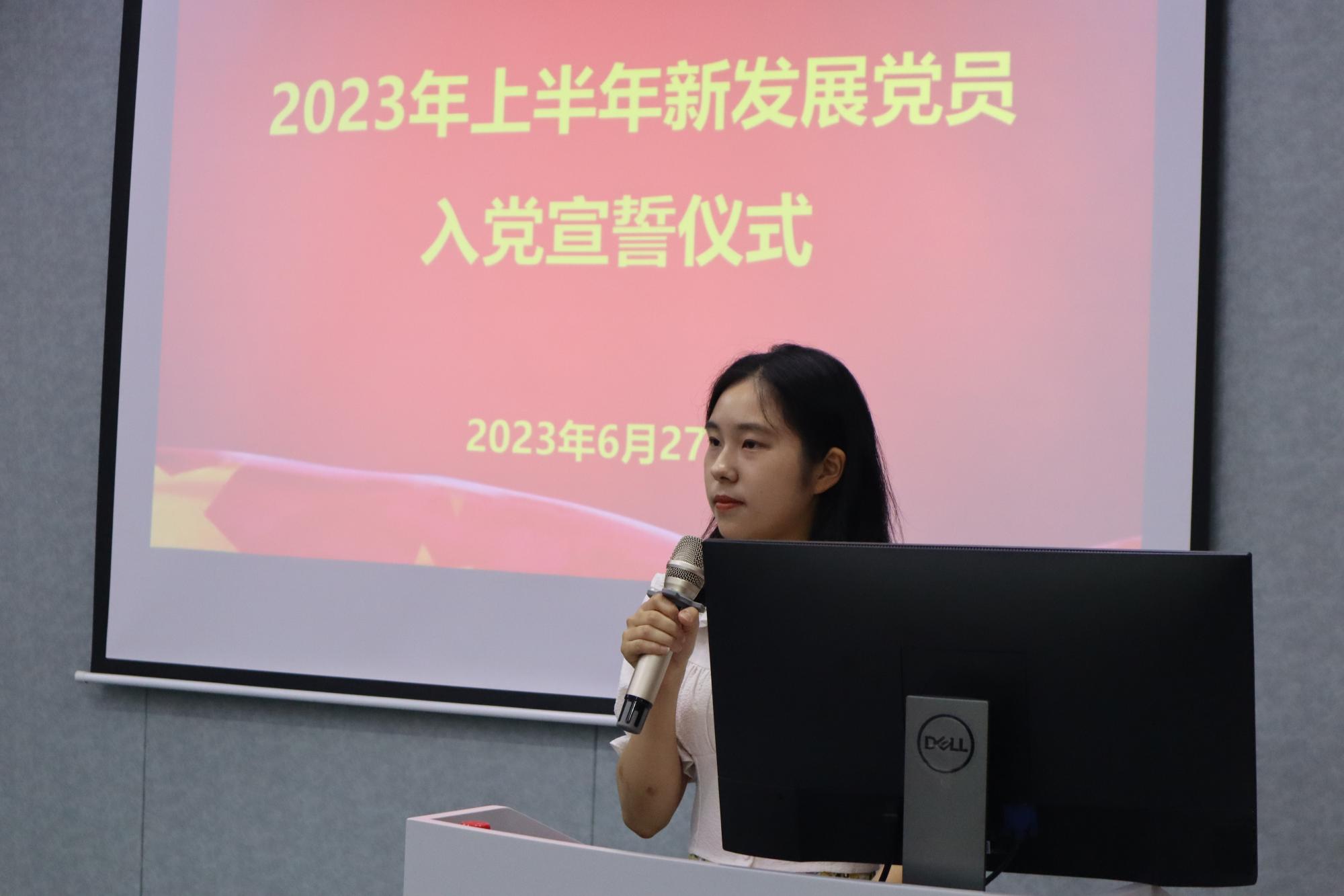 仪式上,张虹书记宣读了2023年上半年新发展党员名单,并为新发展党员代表佩戴党徽。在张虹书记的带领下,全体新发展党员面对党旗宣誓,铿锵有力的誓言抒发着他们对党的忠诚,表达了为党的事业奋斗终身的决心。