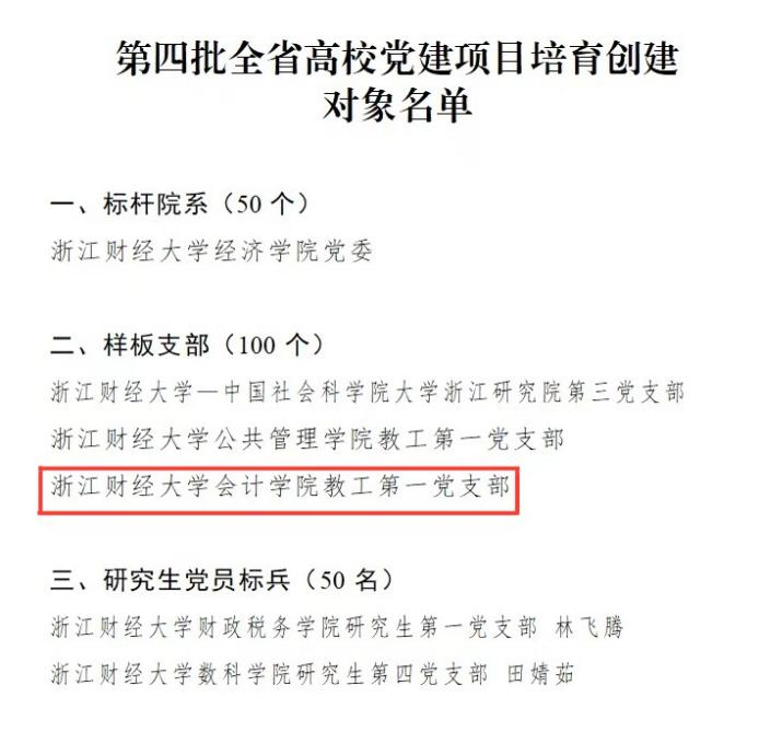 近年来,支部建设成果显著,会计学教师团队入选浙江省首批黄大年式教师团队,10位老师入选财政部全国会计领军人才、浙江省高校领军人才等省级以上荣誉和人才称号,支部成员发表论文75篇,获国家级课题3项,省部级课题10项。