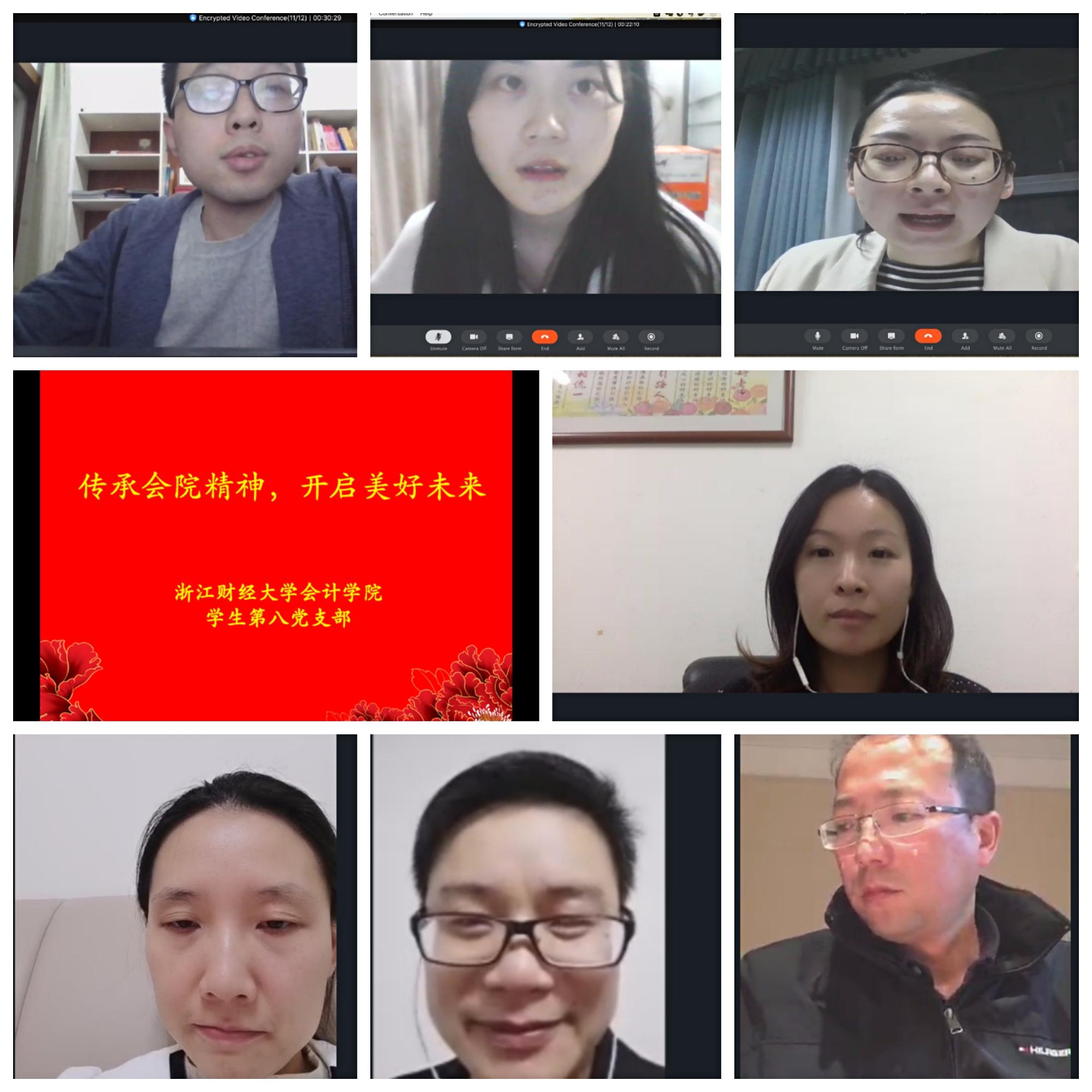 桃灼灼,柳依依,在这个特殊的春天里,永利yl23411官网(MPAcc公司)员工第八党支部党员陈剑和周佳敏两位非全日制MPAcc研究生完成了学业,顺利毕业。离别在即,2020年4月7日晚,支部开展了“传承浙财会院精神,开启美好未来”的云上主题党日活动,公司党委书记张虹、副书记陈炜出席了本次活动,支部全体党员参加了本次主题党日活动。