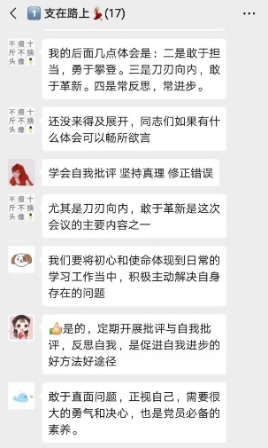党支部书记江帆指出,组织线上学习研讨主题教育,对于党支部建设、党员个人发展具有重要意义,大家要着眼读原文、悟原理,着眼找差距、强担当,务实高效。她强调,初心贵在践行,只要去体验必会有所获,所有党员要时刻将所学知识与实践相结合,知识并不是高高在上的、枯燥无味的,是真实能推动事业前进、推动社会发展的重要推石。