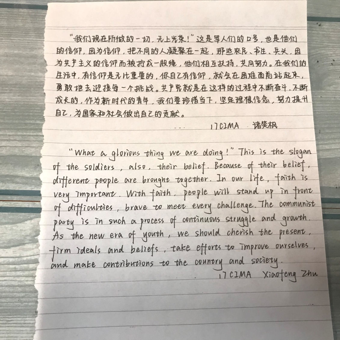 “我们要不断完善和充实自己,把青春激情和活力聚集为实现中华民族伟大复兴梦的正能量,书写无愧于时代的壮丽篇章。We should constantly improve and enrich ourselves, gather youth passion and vitality to realize the positive energy of the great rejuvenation dream of the Chinese nation, and write a magnificent chapter worthy of the times.”——17中加1班吴加勉