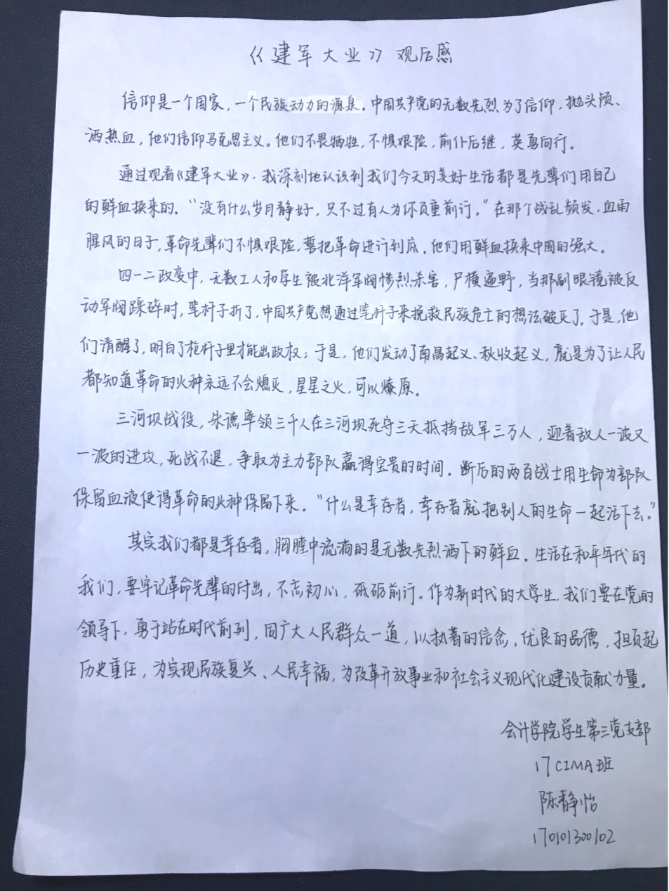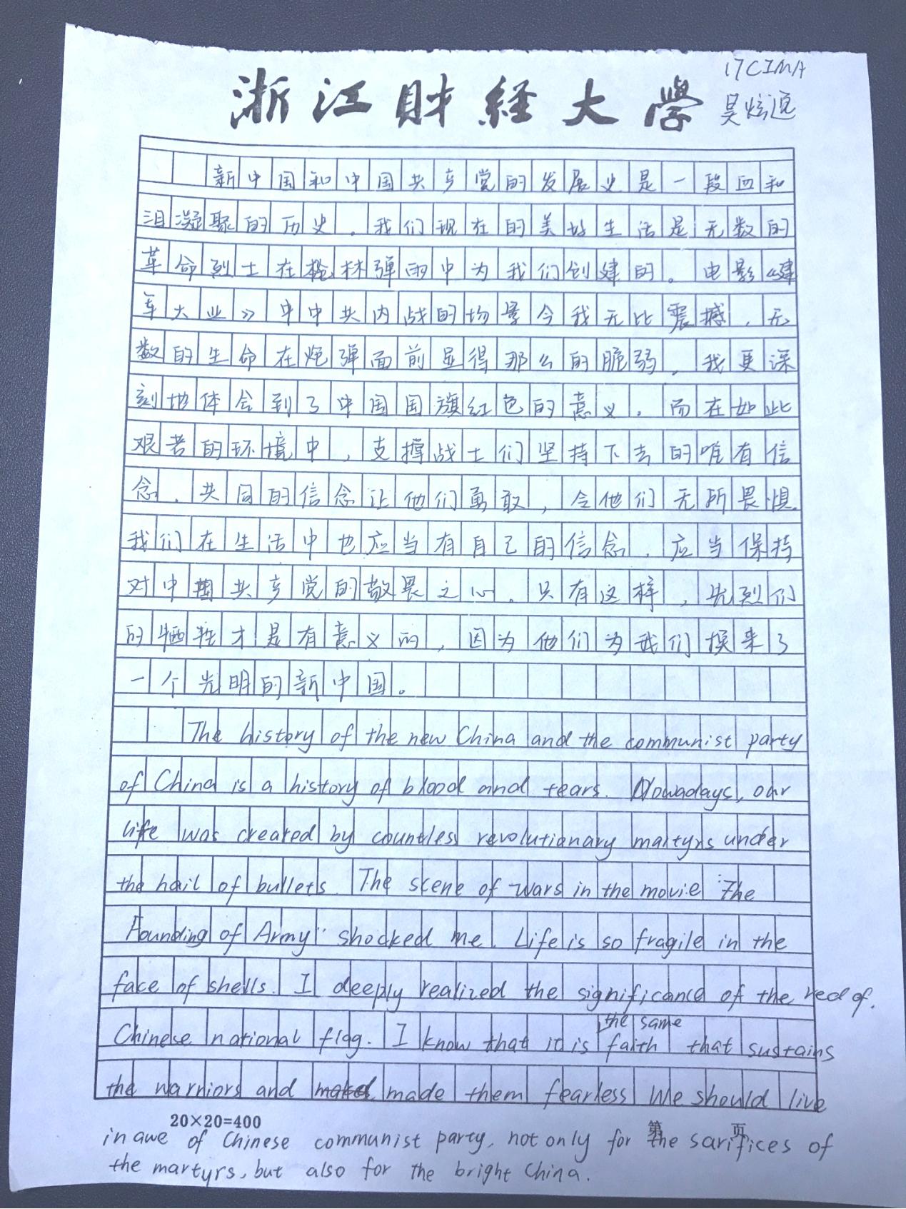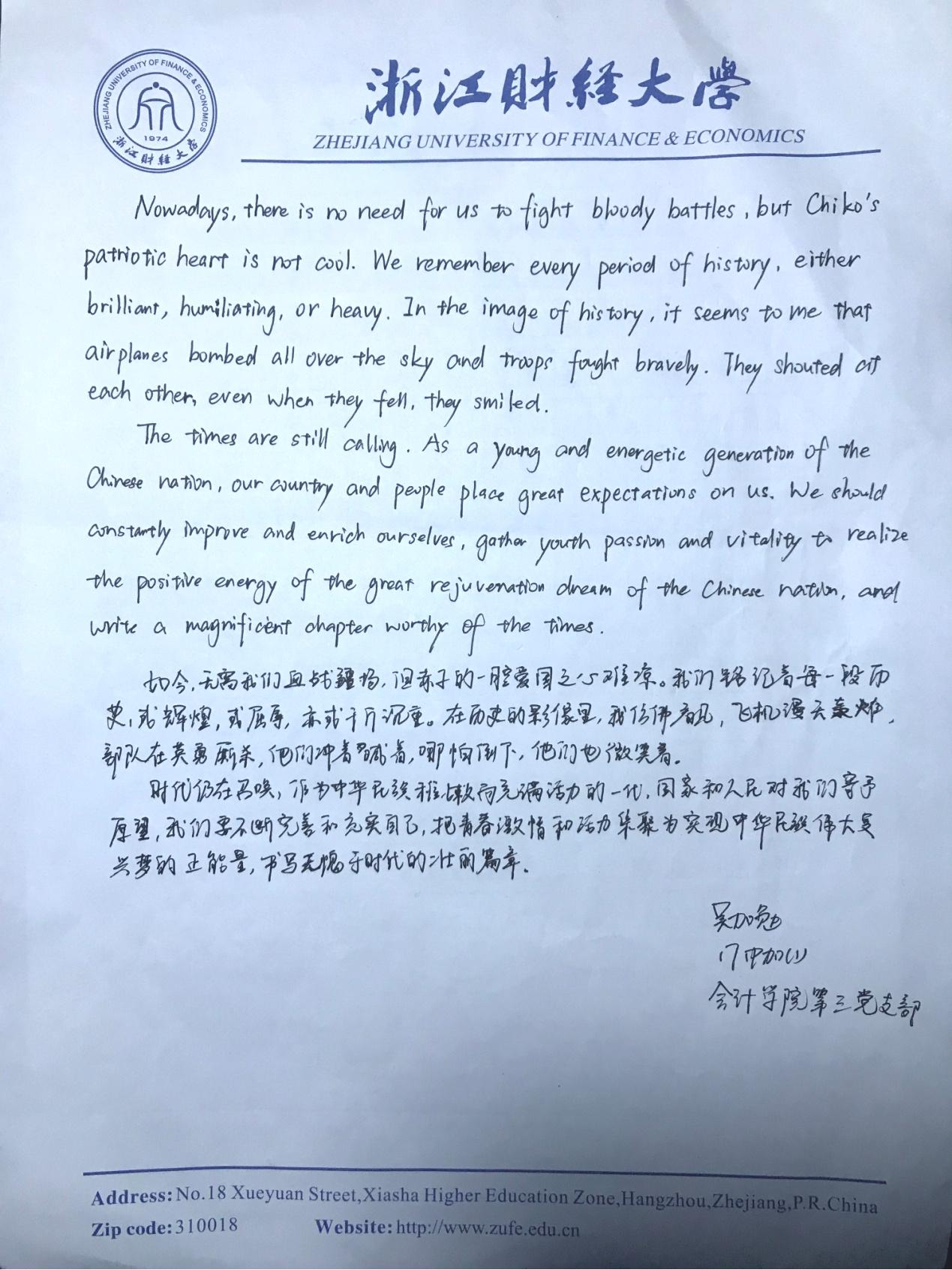 “生活在和平年代的我们,要牢记先辈的付出,不忘初心,砥砺前行。以执着的信念,优良的品德,站在时代前列。”——17CIMA陈静怡