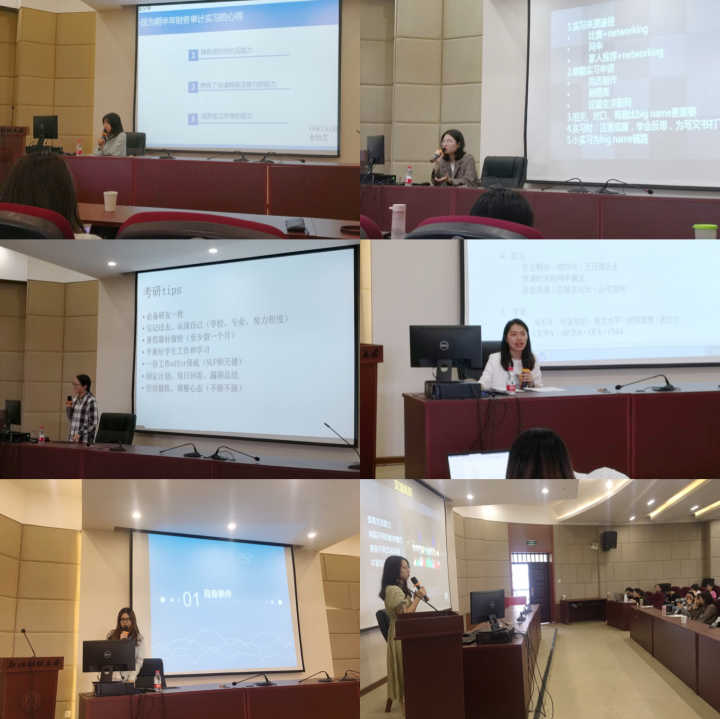 分享会伊始,梁馨捷学姐首先简要讲述了自己在财大本科阶段和美国留学硕士阶段的学习生活,她回眸自身的优点和不足,告诫同学们如何过好老员工活,做好规划,储备好目标规划所需要的必备条件,在高段竞赛、语言提升、实习锻炼、证书储备等方面充实自己,使自己拥有一份有竞争力的简历;她还以自己的求职经历说明目前社会硕士学历是立足中高端企业、职位的门坎,务必“早准备 早完成”才能让自己拥有更大的时间和空间的优势。