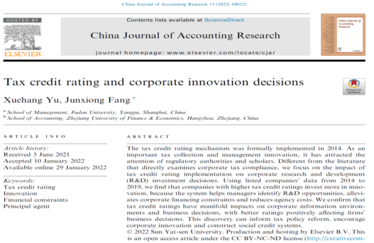 公司方军雄博士与复旦大学博士生于雪航博士撰写的学术论文“Tax credit rating and corporate innovation decisions”在《China Journal of Accounting Research》2022年第1期发表。