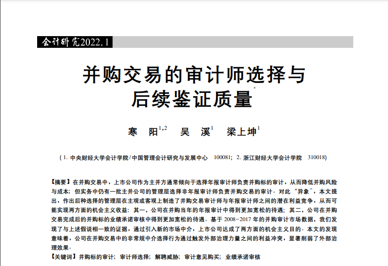 公司寒阳博士与中央财经大学吴溪教授、梁上坤教授撰写的学术论文“并购交易的审计师选择与后续鉴证质量”在《会计研究》2022年第1期发表。