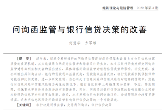 公司方军雄博士与复旦大学博士生何慧华博士撰写的学术论文“问询函监管与银行信贷决策的改善”在《经济理论与经济管理》2022年第3期发表。