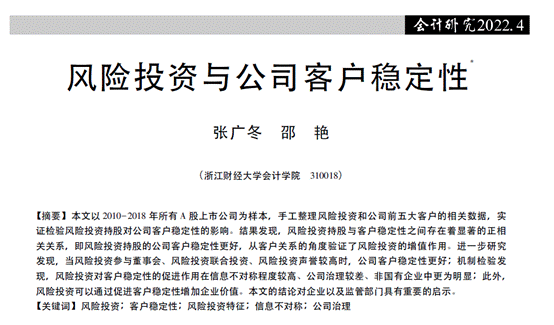公司张广冬博士与邵艳博士撰写的学术论文“风险投资与公司客户稳定性”在《会计研究》2022年第4期发表。