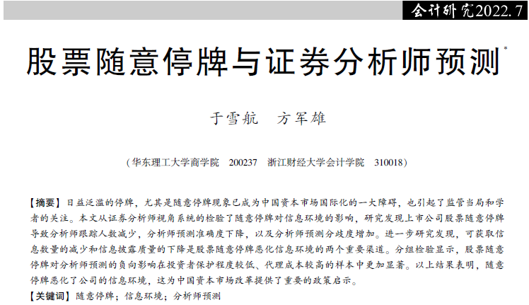 公司方军雄博士与华东理工大学商公司于雪航博士合作撰写的学术论文“股票随意停牌与证券分析师预测”在《会计研究》2022年第7期发表。