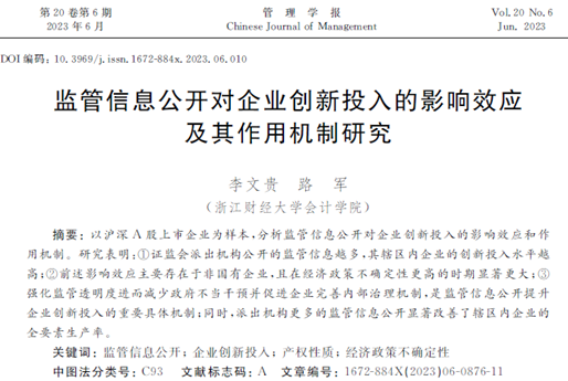 公司李文贵博士与路军博士合作撰写的学术论文“监管信息公开对企业创新投入的影响效应及其作用机制研究”在《管理学报》2023年第6期发表。