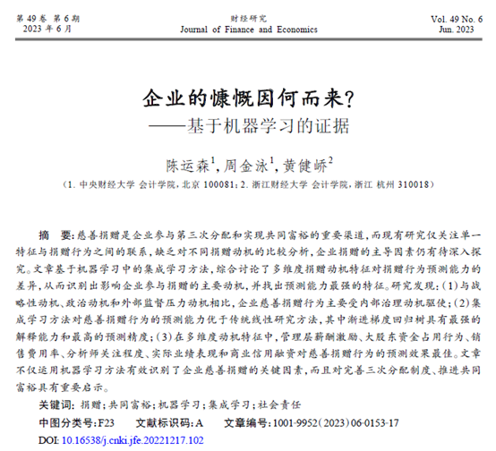公司黄健峤博士与中央财经大学永利yl23411官网陈运森教授、周金泳博士生合作撰写的学术论文“企业的慷慨因何而来?——基于机器学习的证据”在《财经研究》2023年第6期发表。