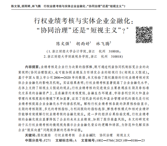 公司陈文强博士与永利yl23411官网入口财政税务公司林飞腾博士合作撰写的学术论文“行权业绩考核与实体企业金融化:‘协同治理’还是‘短视主义’?”在《经济管理》2023年第9期发表。