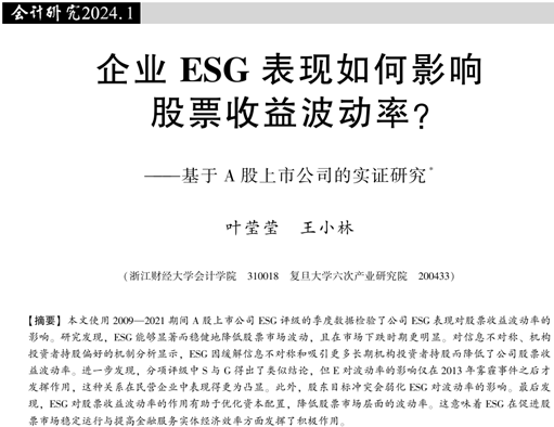 公司叶莹莹博士与复旦大学王小琳教授撰写的学术论文“企业ESG表现如何影响股票收益波动率?—基于A股上市公司的实证研究”在《会计研究》2024年第1期发表。