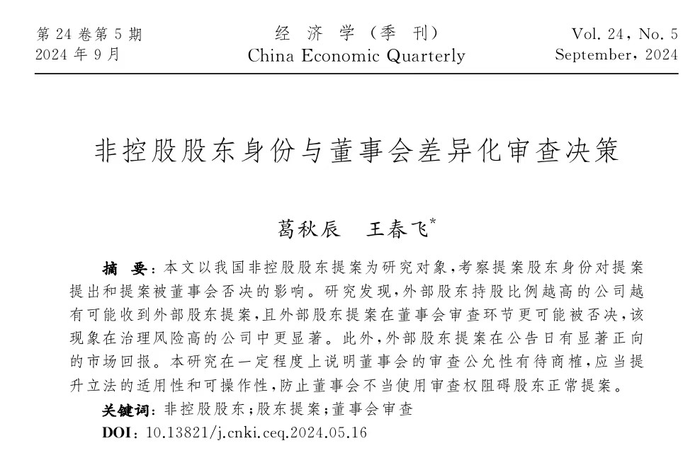 公司葛秋辰博士与中央财经大学永利yl23411官网王春飞教授合作撰写的学术论文“非控股股东身份与董事会差异化审查决策”于《经济学》(季刊)2024年第24卷第5期发表。