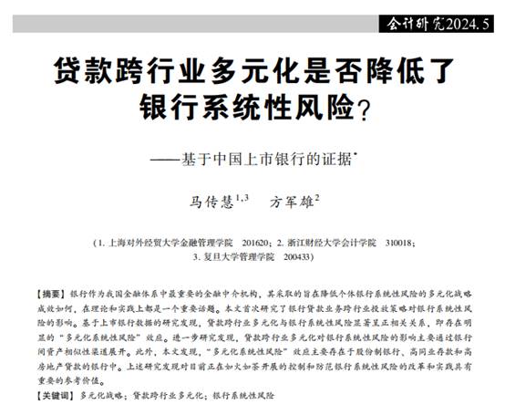 公司方军雄博士与上海对外经贸大学金融管理公司马传慧博士合作撰写的学术论文“贷款跨行业多元化是否降低了银行系统性风险?——基于中国上市银行的证据”在《会计研究》2024年第5期发表。
