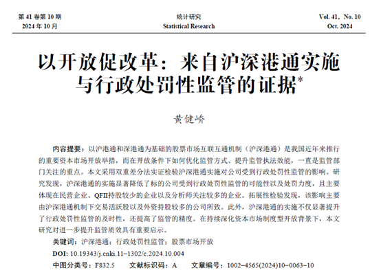 公司黄健峤博士独立撰写的学术论文“以开放促改革:来自沪深港通实施与行政处罚性监管的证据”在《统计研究》2024年第10期发表。