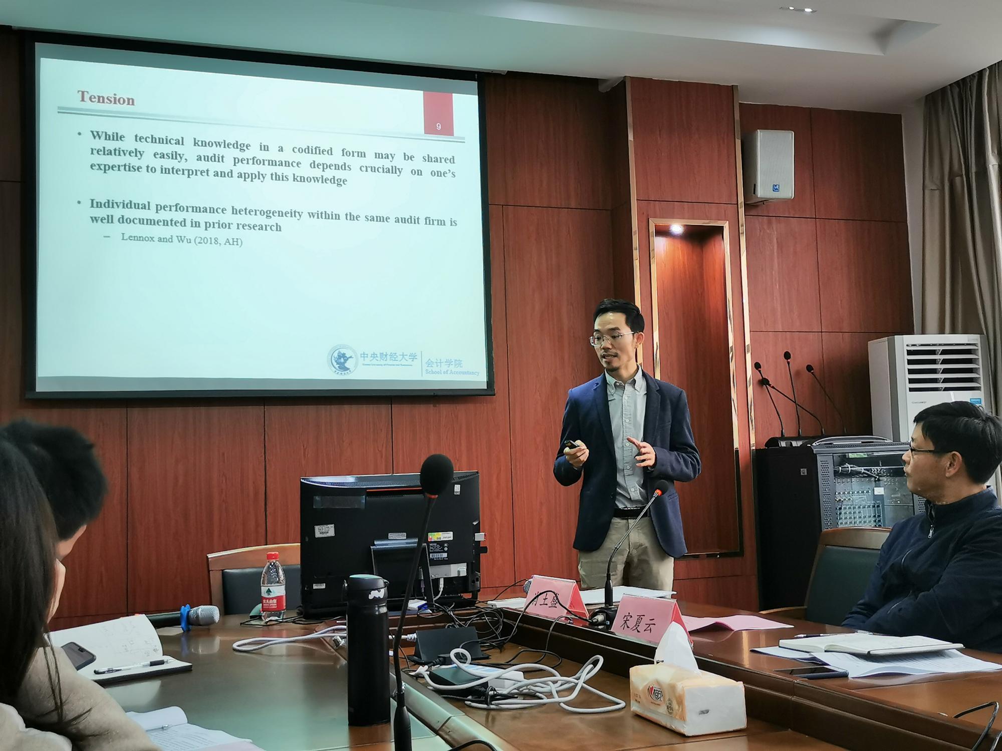 11月26日上午,“浙财会计学术论坛”2020年第2期在永利yl23411官网楼301会议室拉开序幕。本期论坛主题为“Industry-Specific Knowledge Transfer in Audit Firms: Evidence from Audit Firm Mergers in China(审计事务所的特定行业知识转移:来自中国审计事务所合并的证据)”,由现任中央财经大学永利yl23411官网副教授肖土盛主讲。本次论坛由永利yl23411官网宋夏云老师主持,永利yl23411官网2020级全体会计学硕及部分教师参与了此次论坛。