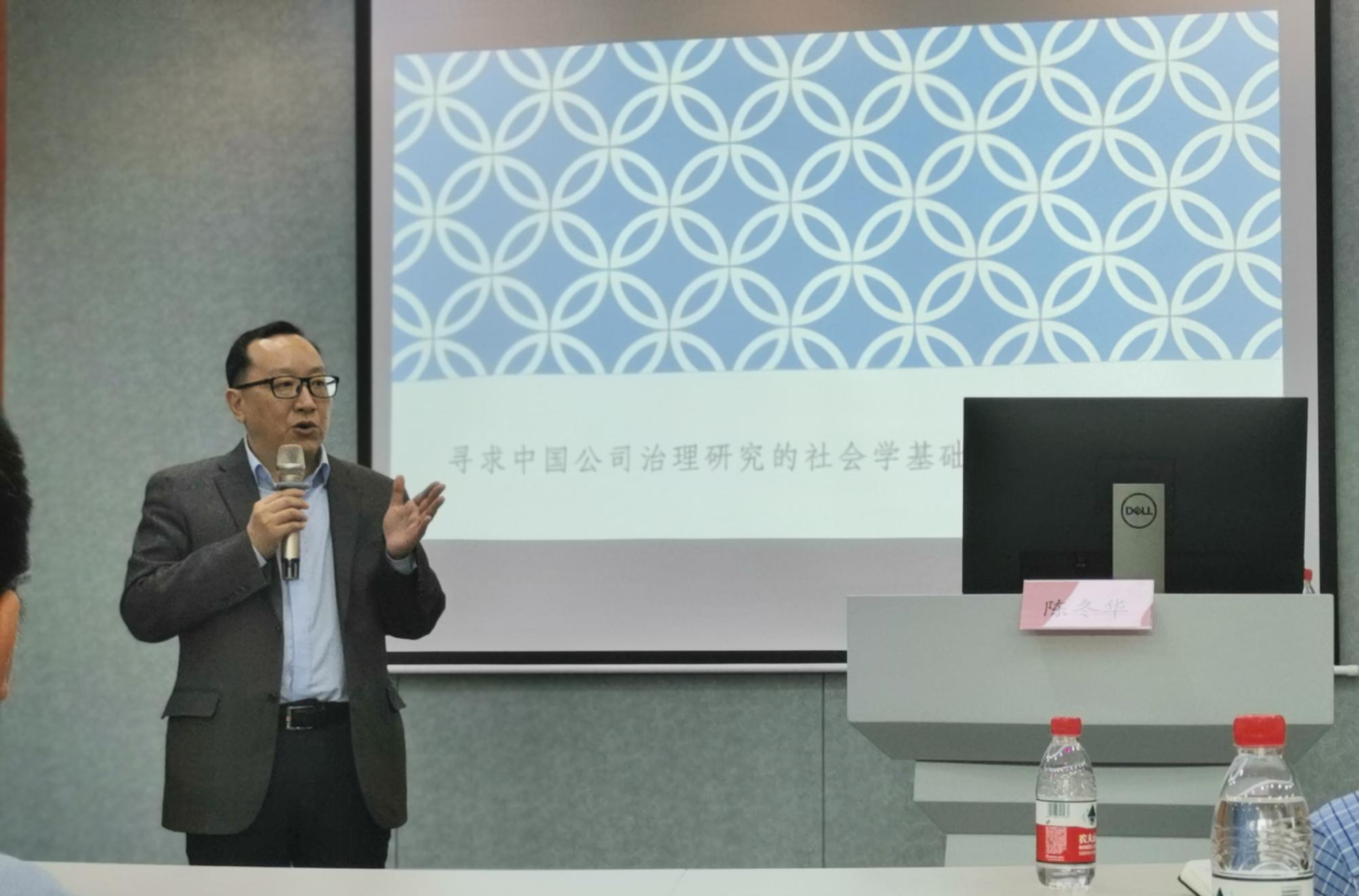 随后,陈教授通过引用文献,从嵌入在关系结构中的激励契约的效率、控制权分配等角度,讲解了何以说公司治理嵌入在社会之中。同时,陈教授认为当前值得公司治理学界重视的社会学研究成果有家族主义、差序格局、关系主义和精英主义等。