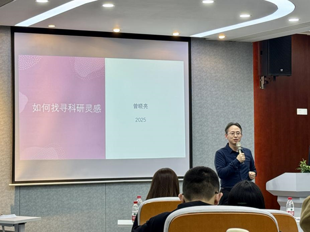 讲座伊始,曾晓亮教授结合自身丰富的科研经验,系统性地分享了学术创新的方法论。他从文献阅读技巧、现实问题观察、跨学科思维等多个维度,深入浅出地讲解了科研灵感的捕捉与培育方法。曾教授特别强调,优秀的科研成果往往源于持续的知识积累、敏锐的问题意识和开放的思维方式。在互动环节,现场师生就研究选题的可行性判断、创新突破点的把握等问题与曾教授进行了热烈讨论。