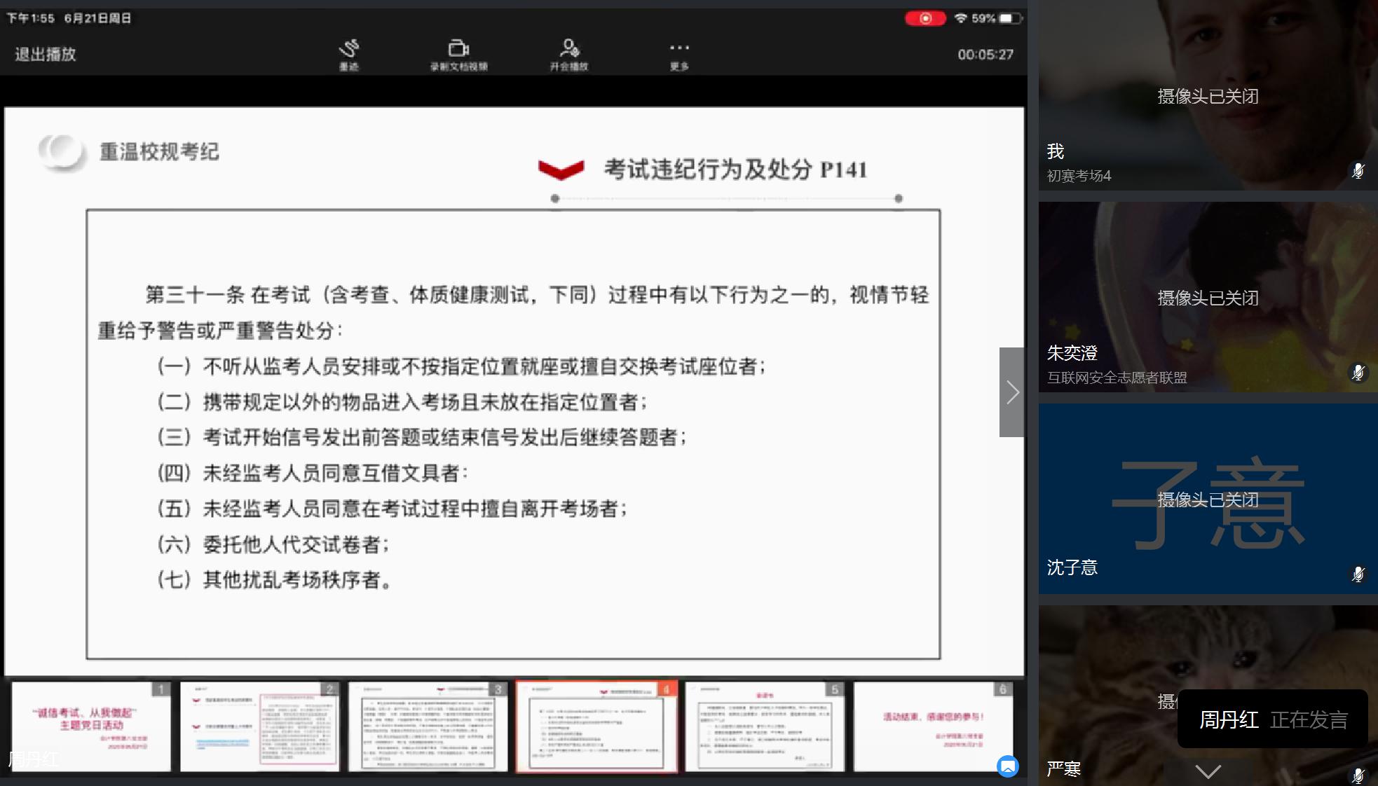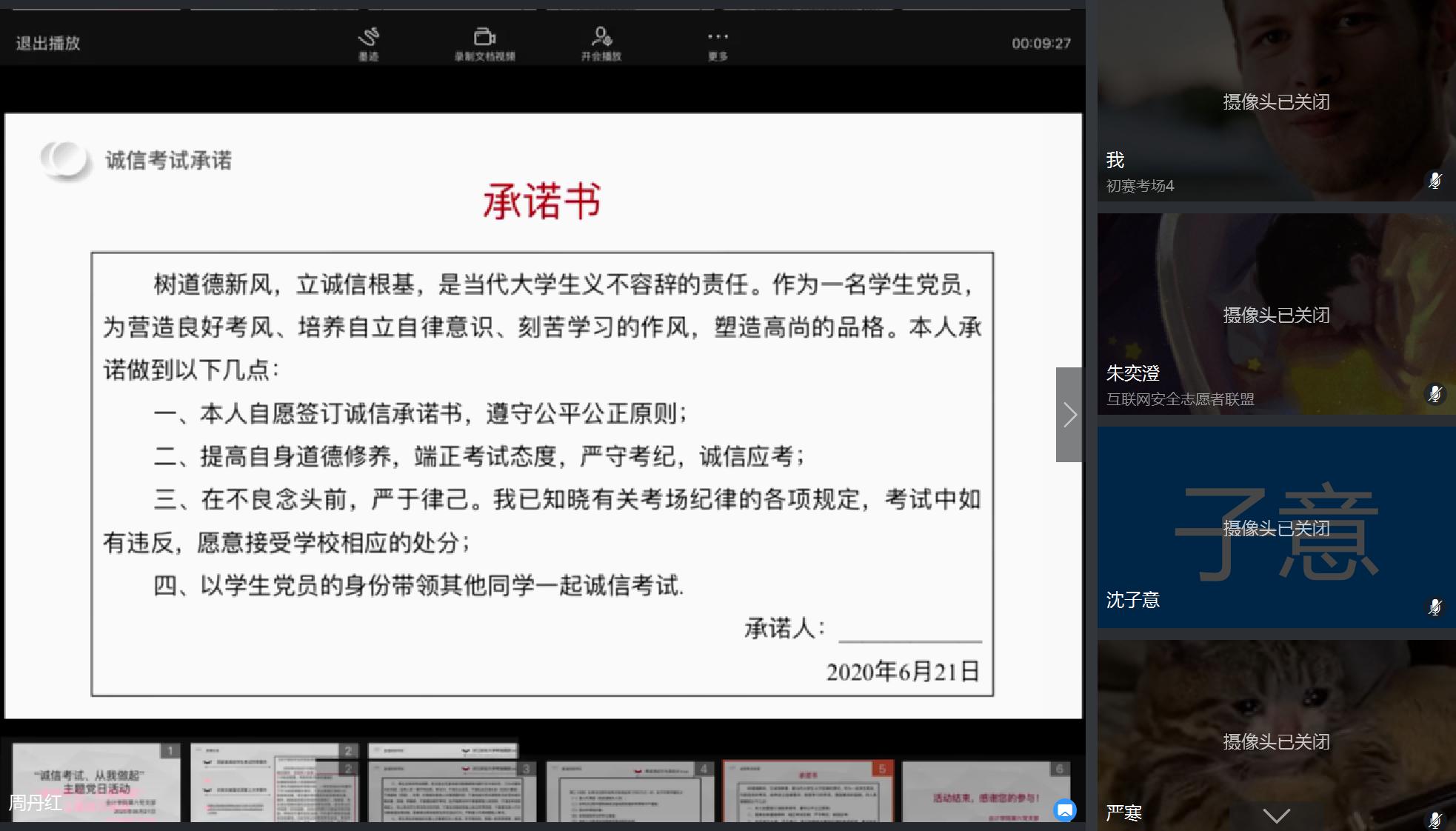 最后我们随周丹红一起进行了诚信考试承诺的云宣誓,承诺“遵守公平公正原则、端正考试态度、严守考纪、诚信应考、严于律己、带领其他同学一起诚信考试”。