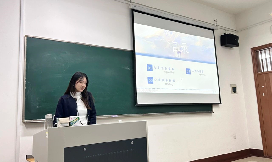 22级的优秀心理委员包宋婷从自身的工作经验展开发言,希望各位心理委员在面对心委工作时可以保持初心和钝感力,要更多地关注当下,而非遥远的、无法确定的未来;只有这样,才能够发现“今天”带来的诸多惊喜。
