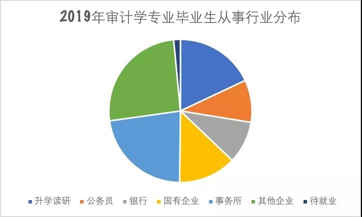 本专业毕业生近年来保持高质量升学就业。一大批员工考取上海财经大学、新加坡国立大学、英国曼彻斯特大学等国内外大学的研究生进行深造学习。其余员工大多进入国家机关、大型国企、银行和事务所等高质量就业单位工作。2019年有近10%的同学考取公务员。下图为毕业生从事行业分布图。