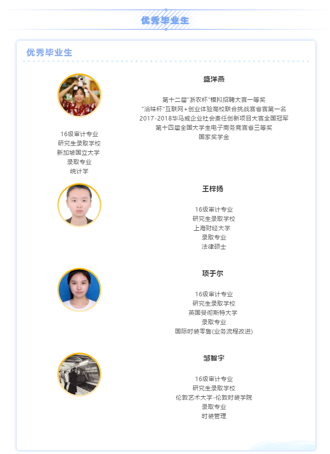 永利yl23411官网入口审计学专业,为浙江省首批一流本科专业建设点,是省级重点建设专业和省“十三五”特色专业,具有审计硕士专业学位授予权。审计学专业位居全国前5%,在中国科教评价研究院和武汉大学中国科学评价研究中心联合发布《中国大学及学科专业评价报告(2020-2021)》被评为5★+专业。