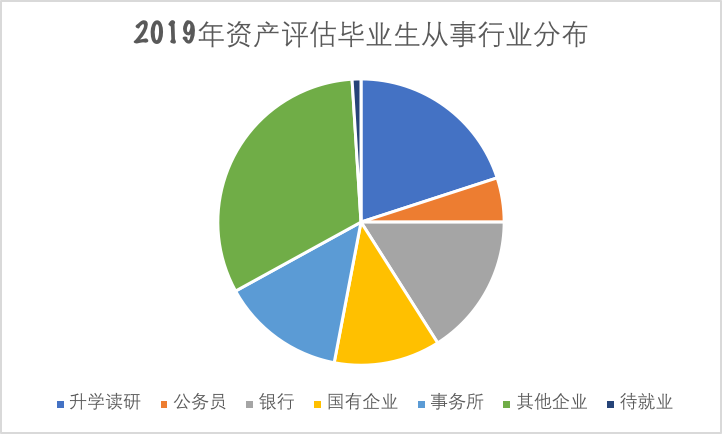 本专业毕业生近年来保持高质量升学就业。一方面,一大批员工考取上海财经大学、英国布里斯托大学等国内外大学研究生进行深造学习。另一方面,大部分同学在校期间考取“资产评估师”职业资格。作为本科在校期间就能拿到的带有签字权的证书,为员工高质量就业保驾护航,大部分同学进入国家机关、事务所、银行和国有企业工作。下图为2019年毕业生从事行业分布图。