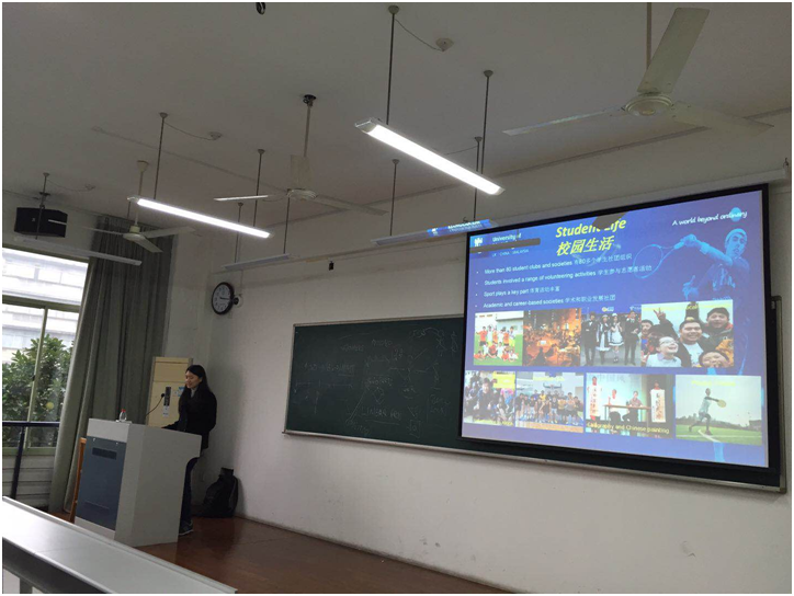 随后,宁波诺丁汉大学的商公司招生主管Ms Claire Shi给大家介绍了宁波诺丁汉大学的学术、教育、校园文化等等,给我们国际化的培养方式带来了新的启迪。