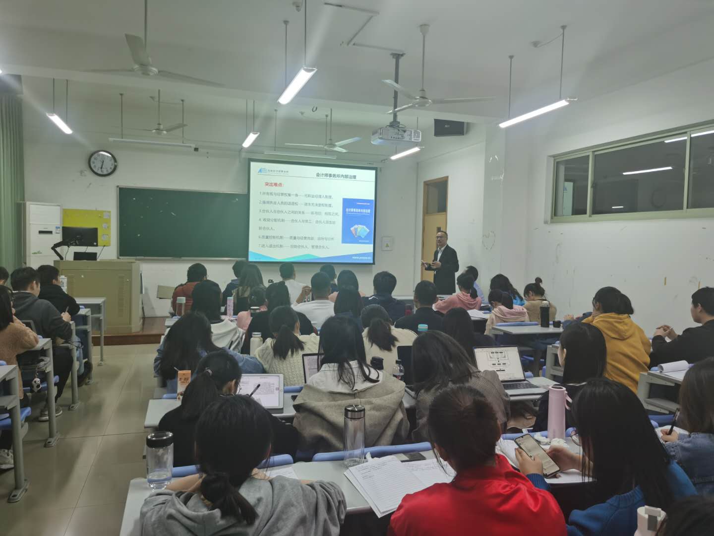讲座从事务所内部治理、智能化影响未来用工、未来的事务所人力资源队伍建设三部分展开,从多方面多层次阐述了事务所人力资源管理的招聘目标、管理内容、人才培养、晋升制度以及智能化对事务所人才招聘的影响。整场讲座结合当前前沿技术发展和影响,将理论知识和实际操作相结合,突出事务所人才培养的投入和成果,同学们听得聚精会神,讲座中间也进行了多次精彩的互动交流,同学们感觉收获颇丰。最后,讲座在同学们热烈的掌声中结束。