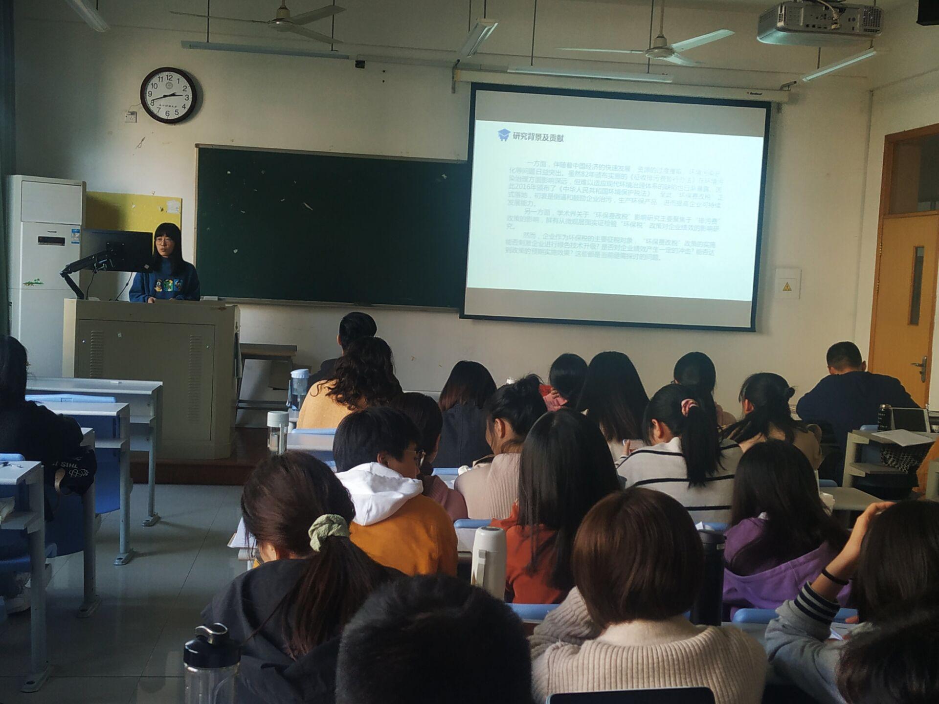 其次,王乐青同学汇报的文章题目为《“环保费改税”会影响企业绩效吗》。文章基于2018年实施的“环保税”我国税制改革背景,以2017——2018年1150家上市公司为研究样本,采用双重差分法实证检验了环保费改税的微观经济效应,结果表明,“环保费改税”政策的实施尚未产生预期效应,对企业绩效的影响在短期内并不明显,且在企业个体维度和时间维度的变化上存在不规则特征。可见,环保税政策有待我国持续有效推行并强化其实施效果,以此促进企业通过技术升级改善生态环境,实现经济的可持续增长。