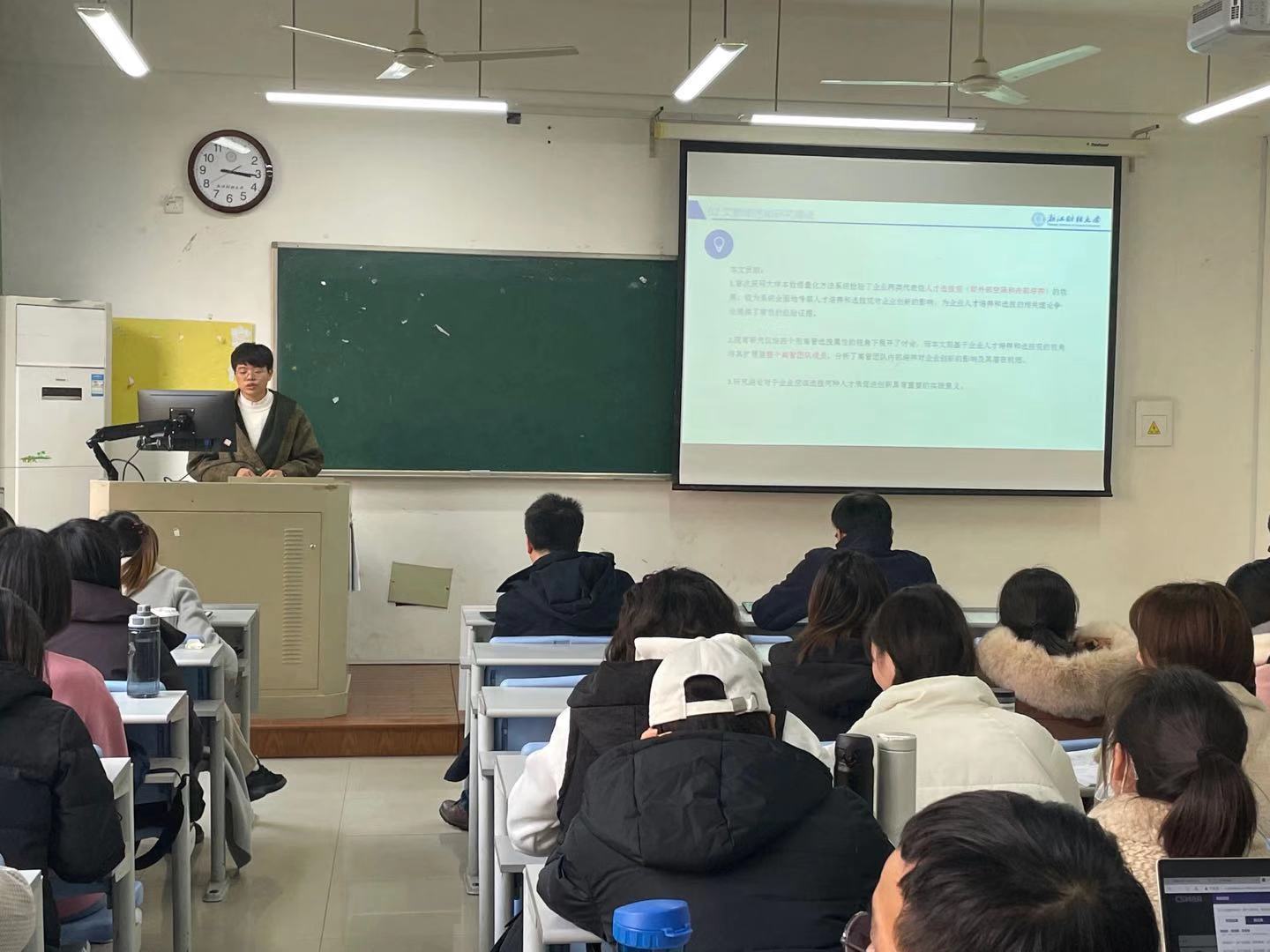 最后,在两位同学精彩的汇报之后,两位老师也做出了精彩点评。总结来看,杨庆老师就俞佳萍同学汇报的论文做了细致的点评。如文章的选题切入点较新,这是我们在寻找选题时可以借鉴的一点,我们同样也可以就这些问题进行更深入的思考;同时老师也建议大家更多的将论文的内容与实际生活相结合,帮助我们更好的理解文章以及发散思维。黄健峤老师也就章佳玲同学的文章分享了自己的看法。黄健峤老师提到作者发表的这篇文章可以与我们实际生活中大家熟知的夫妻共同持股的家族企业实例相结合来理解文章的研究理论;同时黄老师还评价了汇报的同学PPT做的内容逻辑清晰,值得学习。