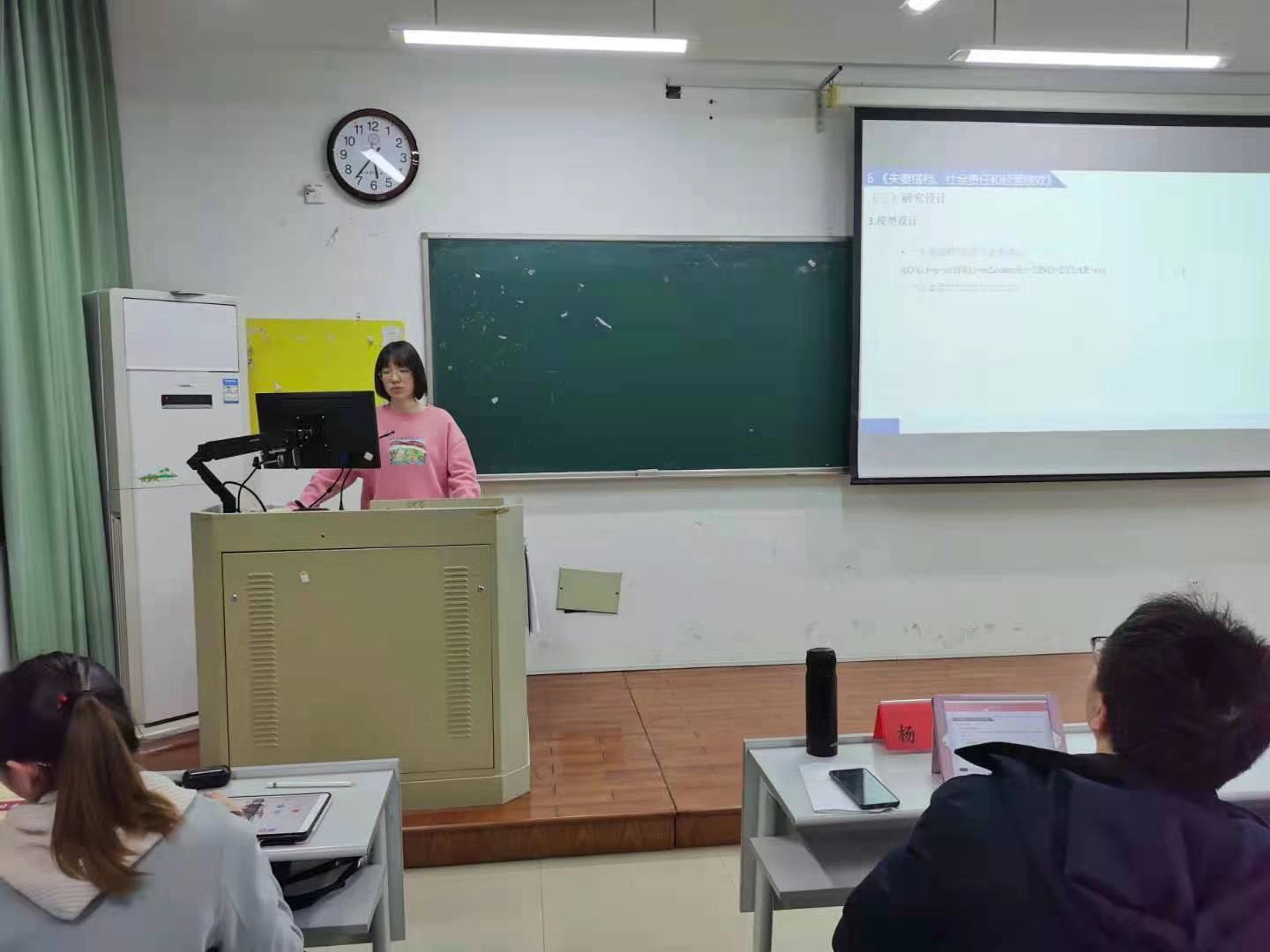 其次,章佳玲同学汇报的文章题目为《“保守”的婚姻:夫妻共同持股与公司风险承担》。文章基于婚姻和性别是影响经济主体风险决策行为的关键因素。以2007-2015年中国上市家族企业为样本,实证检验了实际控制人夫妻共同持股对公司风险承担水平的影响.结果表明,由夫妻共同持股的家族企业,其杠杆水平显著更低,现金持有水平显著更高;妻子持有股份会显著的提高进入公司任职的概率并且增加公司聘用女性高管的概率,同时乐意与妻子共享股份的丈夫大男子主义倾向更低,这些因素使得公司风险承担水平更低。进一步研究发现,夫妻共同持股对公司风险承担的作用受管理层夫妻双方的亲戚涉入,双方学历差异以及地区婚姻氛围影响。论文同时将婚姻和性别问题与公司财务行为结合,探讨了“夫妻店”式家族企业的风险承担特点,发现企业家的夫妻关系具有超出家庭范围的影响。这为从更广阔的视野理解家族企业的的决策模式和财务行为提供了新思路。