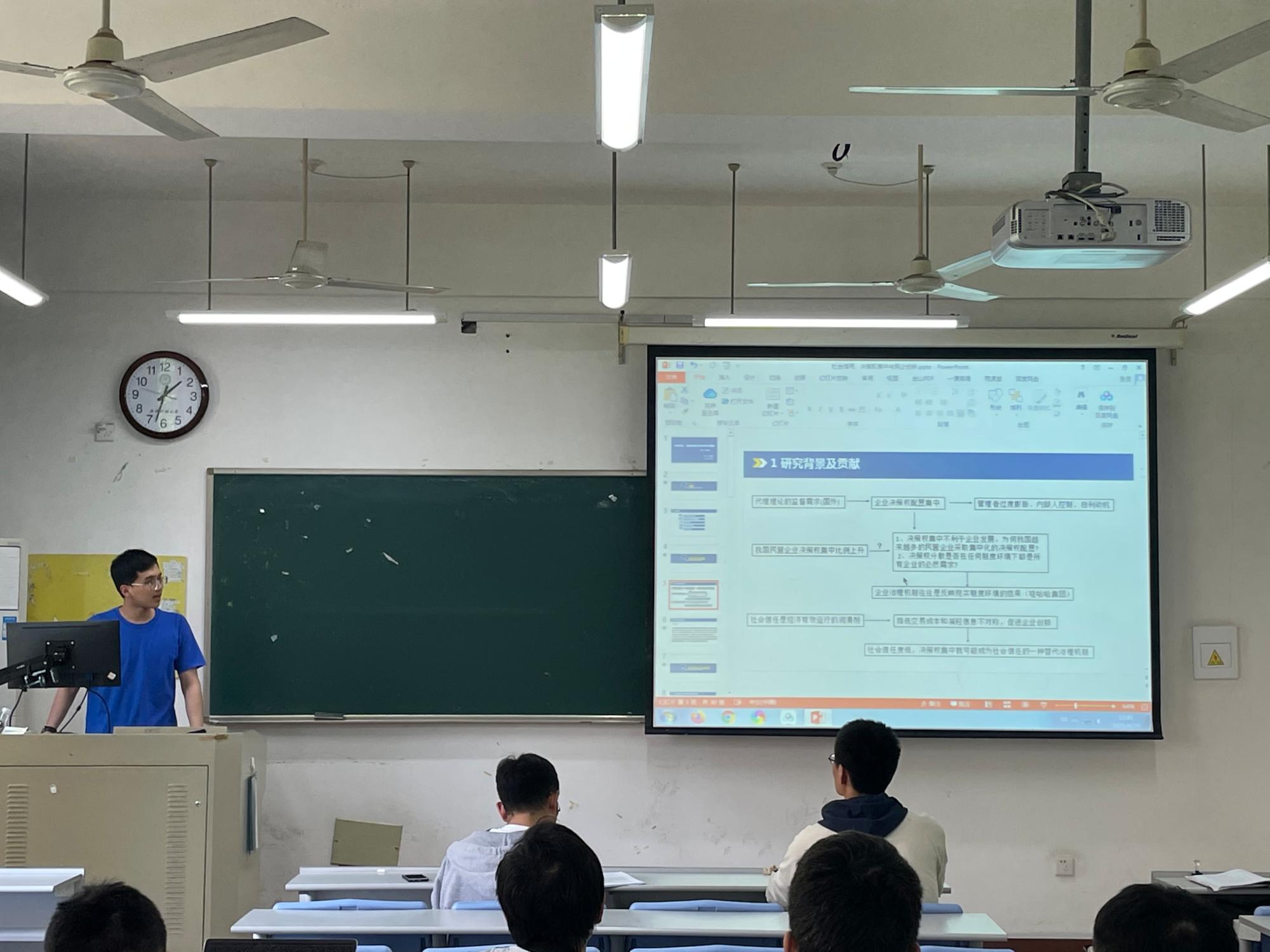 其次,陈奕钢同学汇报的文章题目为《社会信任、决策权集中与民营企业创新》。文章认为有效的治理机制应当契合企业所处的制度环境,当前治理结构中决策权集中可能是中国民营企业在社会信任不足环境下的一种内在需求。论文分析了社会信任对民营企业内部决策权配置的影响及其经济后果。研究发现,地区社会信任水平越低,民营企业越可能以集中方式配置决策权;决策权集中在整体上显著提升了民营企业的创新水平,且这种创新提升效应在社会信任度更低的地区更显著。