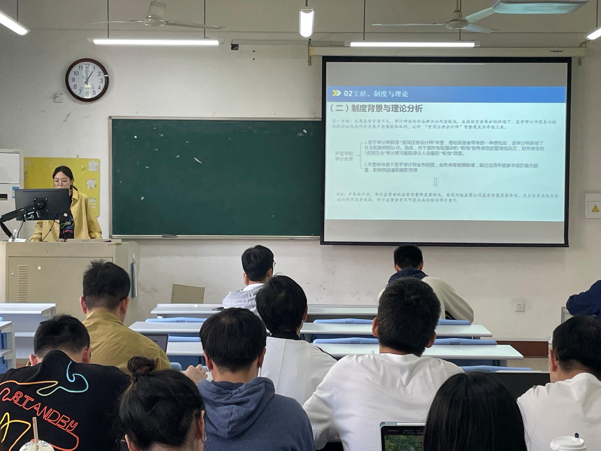 首先,郑筱思同学汇报的文章题目为《监督者声誉提升机制的治理效应研究——来自签字审计师声誉提升的经验证据》。该文利用中国注册会计师协会评审 “资深注册会计师”引发的签字审计师声誉变动事件,研究发现,作为财务报告生成和披露的重要监督者,签字审计师获得 “资深注册会计师”荣誉后,更可能出具非标准审计意见,被监督公司盈余质量显著提高、发生财务违规或重述的概率显著降低,声誉提升带来的治理效应符合成本效益原则,且在制度环境较好地区更加显著。这些结果表明,声誉提升机制在转轨经济市场审计监督治理中扮演的主导角色是 “激励”而非“寻租”。